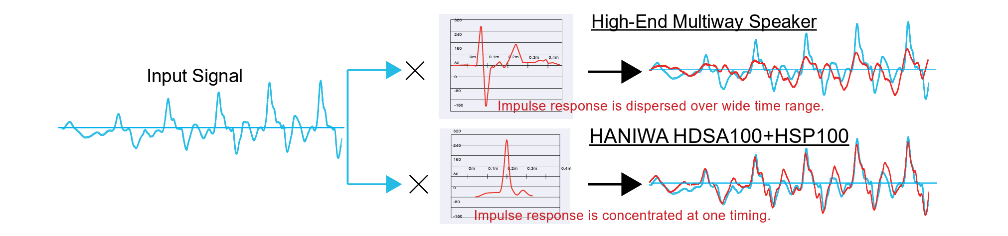 Input signal (blue) is transformed differently by each system. The high-end multiway speaker (priced over $200,000 USD) disperses the impulse response* over time, distorting the output. The Haniwa system concentrates the impulse response at one precise moment, preserving the original waveform.